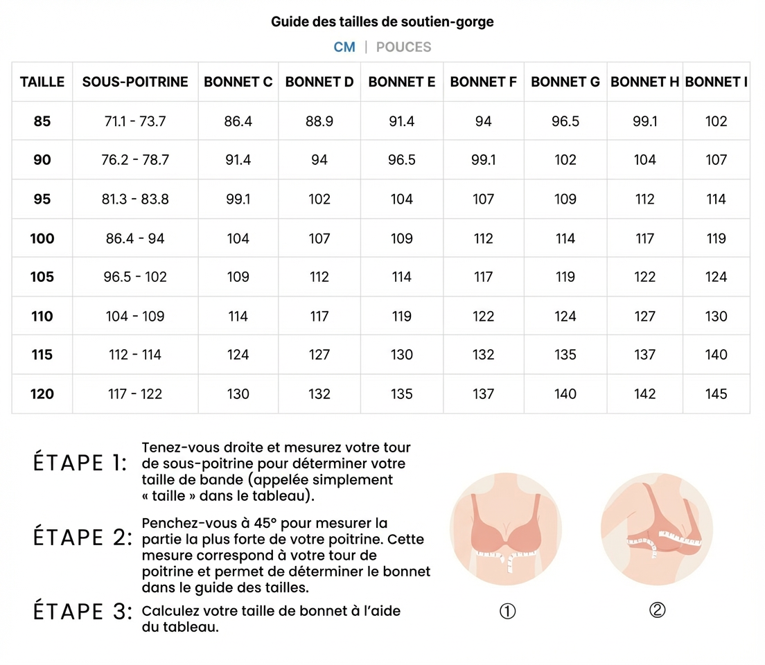 | Tour de bas de poitrine/Bonnet | B | C | D | E | F | G |