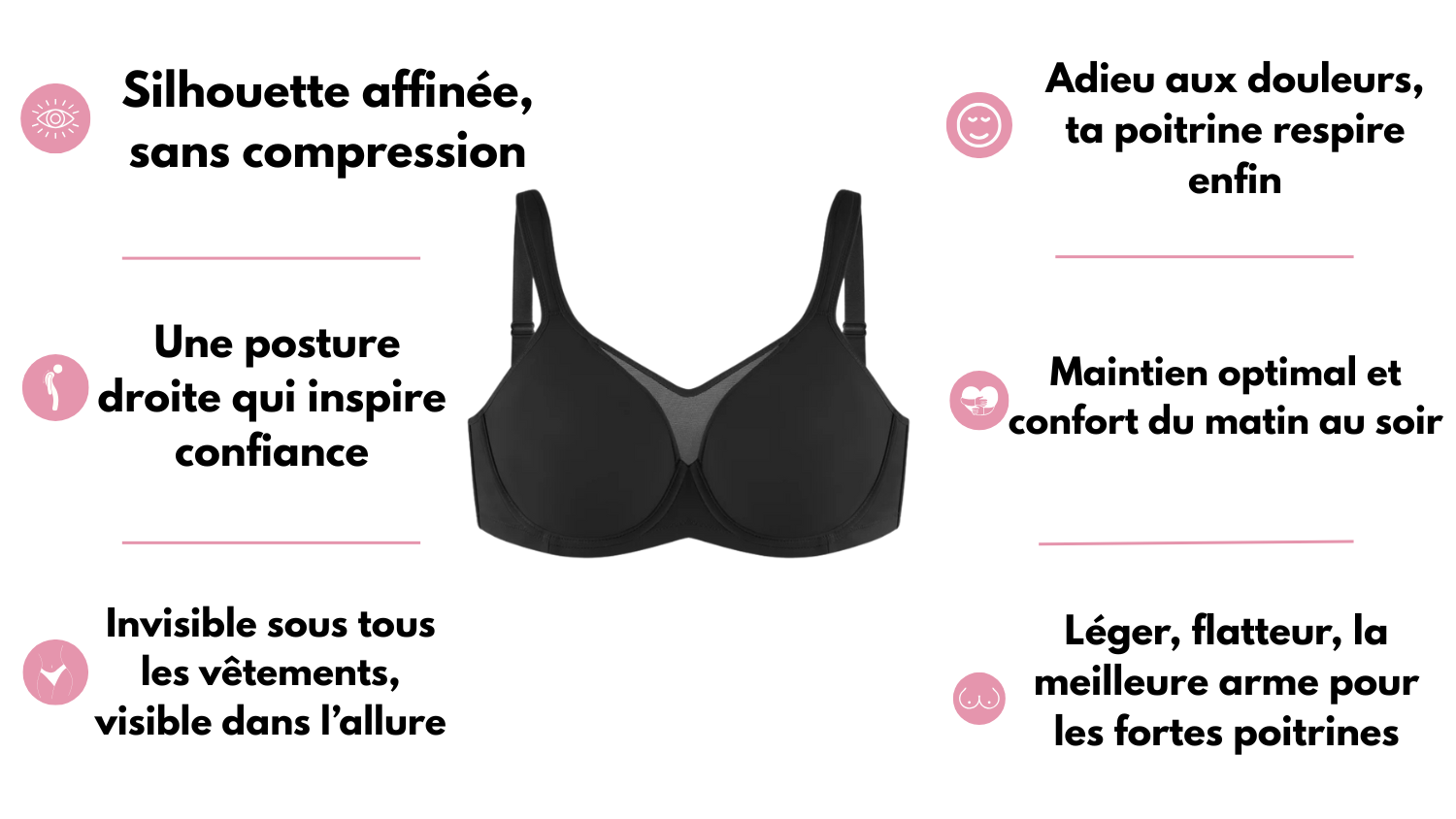 Pour les femmes à poitrine généreuse qui refusent de choisir entre confiance et maintien invisible, ce soutien-gorge minimiseur redéfinit l'élégance discrète.